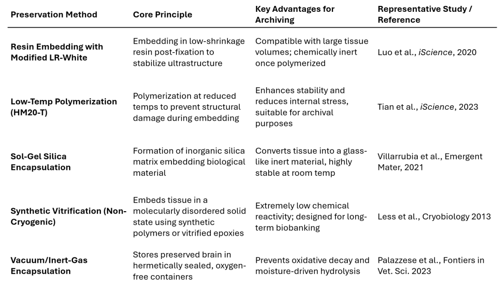 Notably, an effective methodology to achieve this is currently available: the first ingredient is a chemical process called cross-linking, where a perfused chemical agent provides something similar to a scaffolding to keep the structure of proteins and other small molecules in place. However, over the weeks and months, residual enzymatic and thermal effects can break down the cross-linking, hence a second step is necessary to ensure long-term structural integrity. In resin embedding methods, a resin permeates through every “nook and cranny” in the neural tissue, acting like cement to keep biological structures in place. For an analogy, this is akin to what is observed when an insect is embedded in jade, with a preservation of relatively fine structural elements lasting possibly for millions of years.